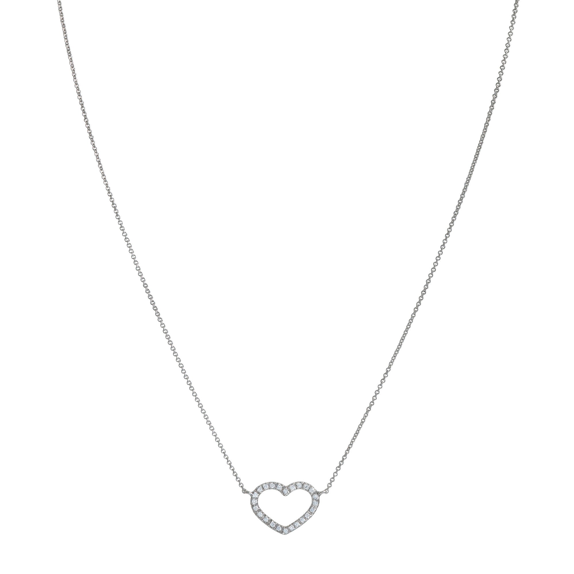 Material: 18 kt white or pink gold Stones: 24 ct white diamonds. 0.18 Heart Width: 1.4cm x 1.1cm Chain Length: 42cm