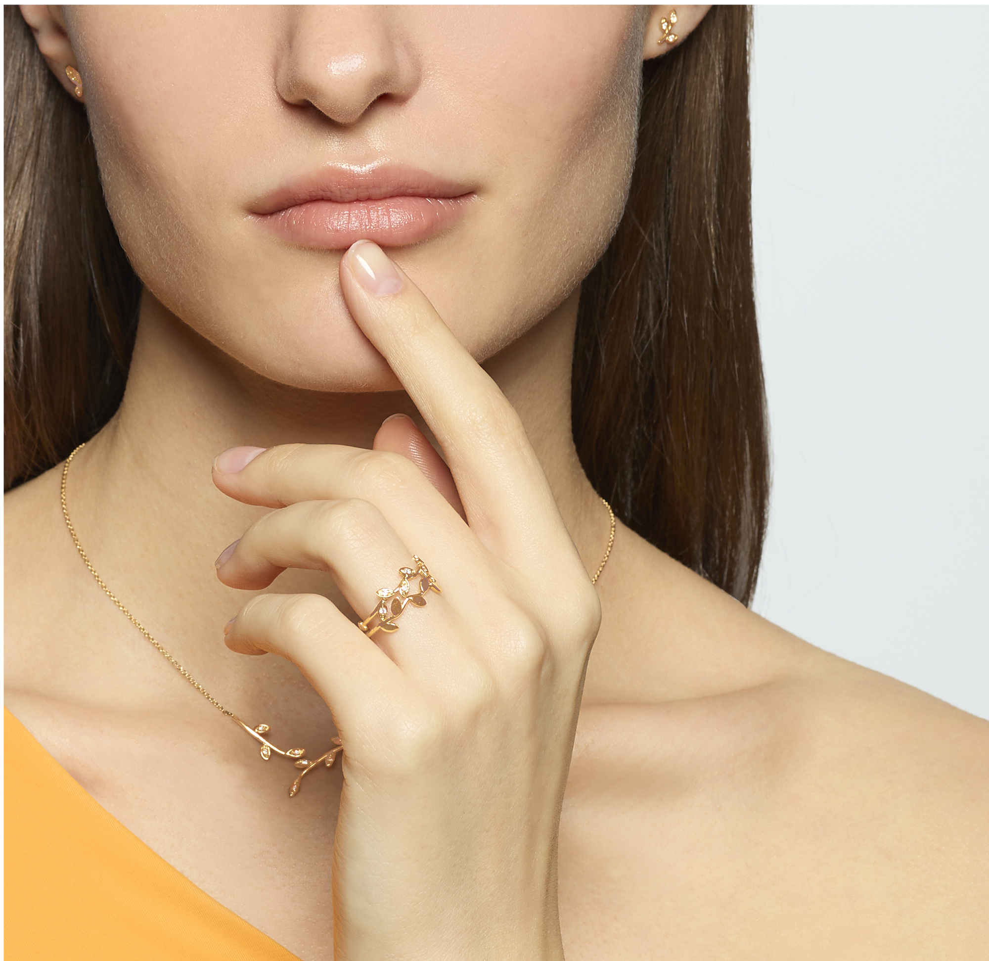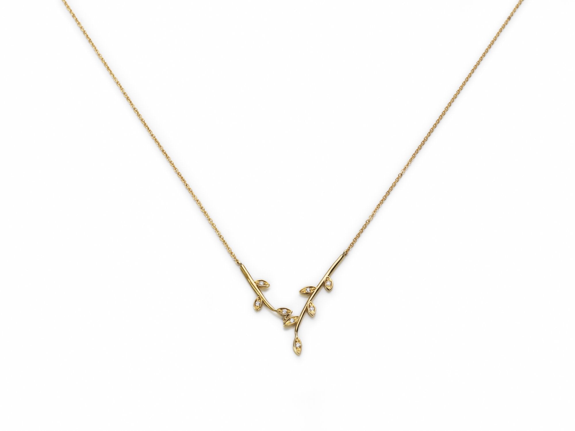 Refined and bucolic, the Flora collection celebrates the vitality of nature by interpreting the art of jewelery in a contemporary way. The Necklace made of 18 kt yellow gold chain features two sprigs with slab leaves and white diamonds which make it a precious and delicate jewel. Wear it alone or combined with other jewels from the Flora collection.