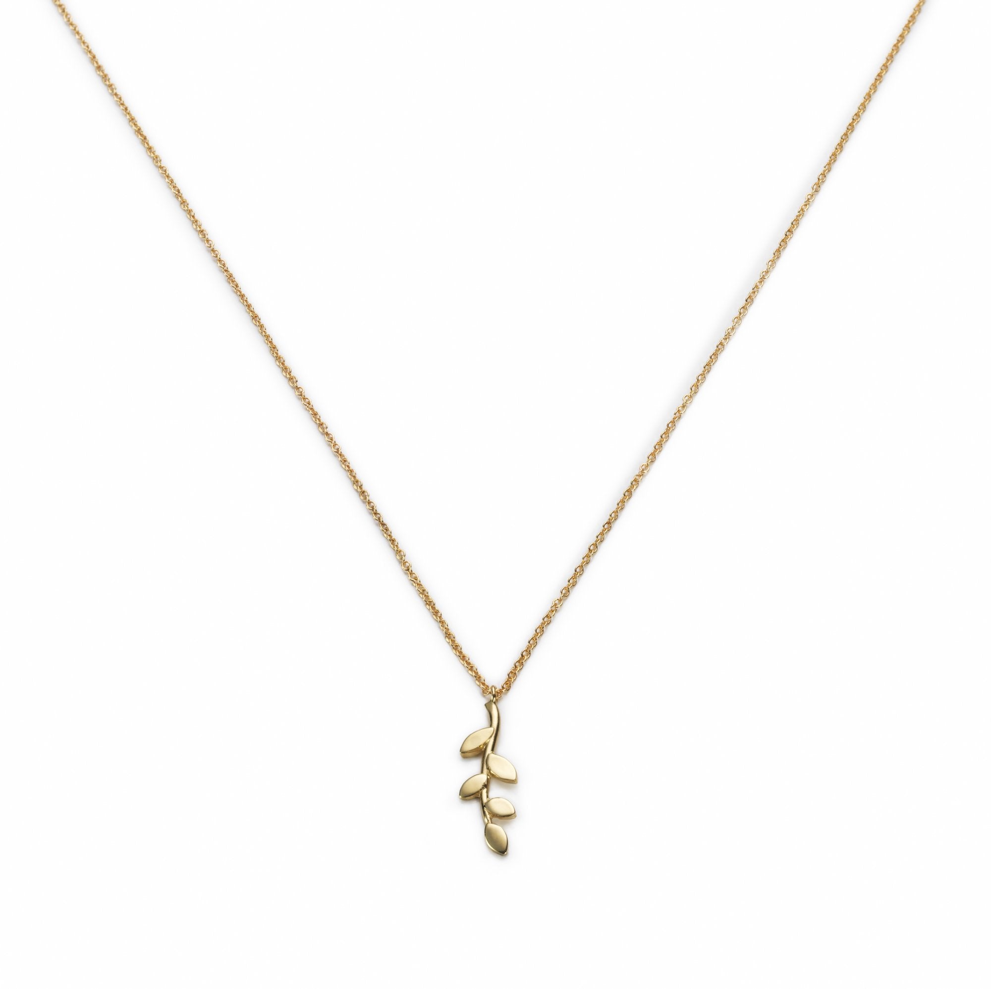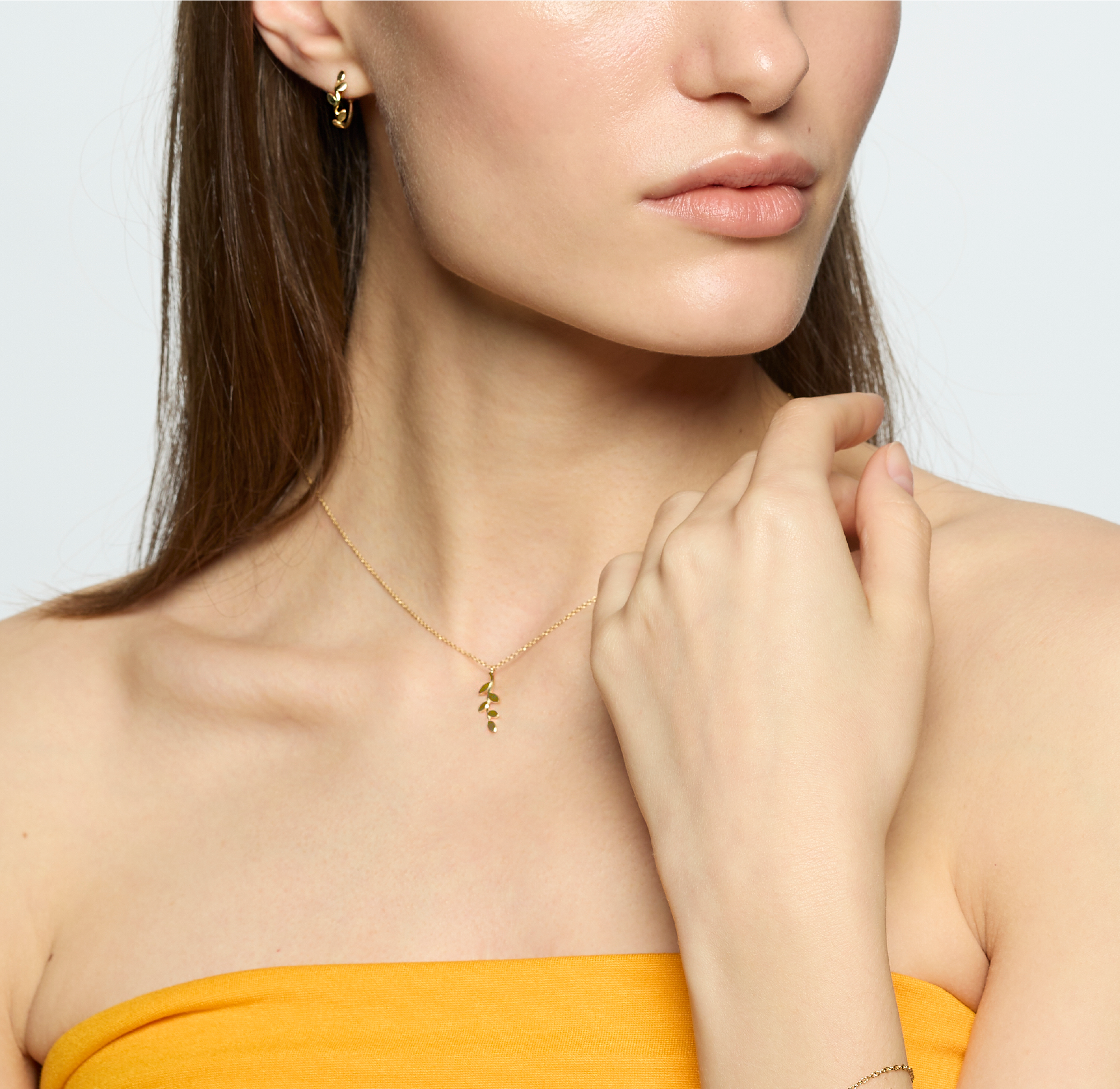 Refined and bucolic, the Flora collection celebrates the vitality of nature by interpreting the art of jewelery in a contemporary way. The Necklace made of 18 kt yellow gold chain features a sprig with slab-shaped leaves that make it a minimal and versatile creation. Wear it alone or combined with other jewels from the Flora collection.