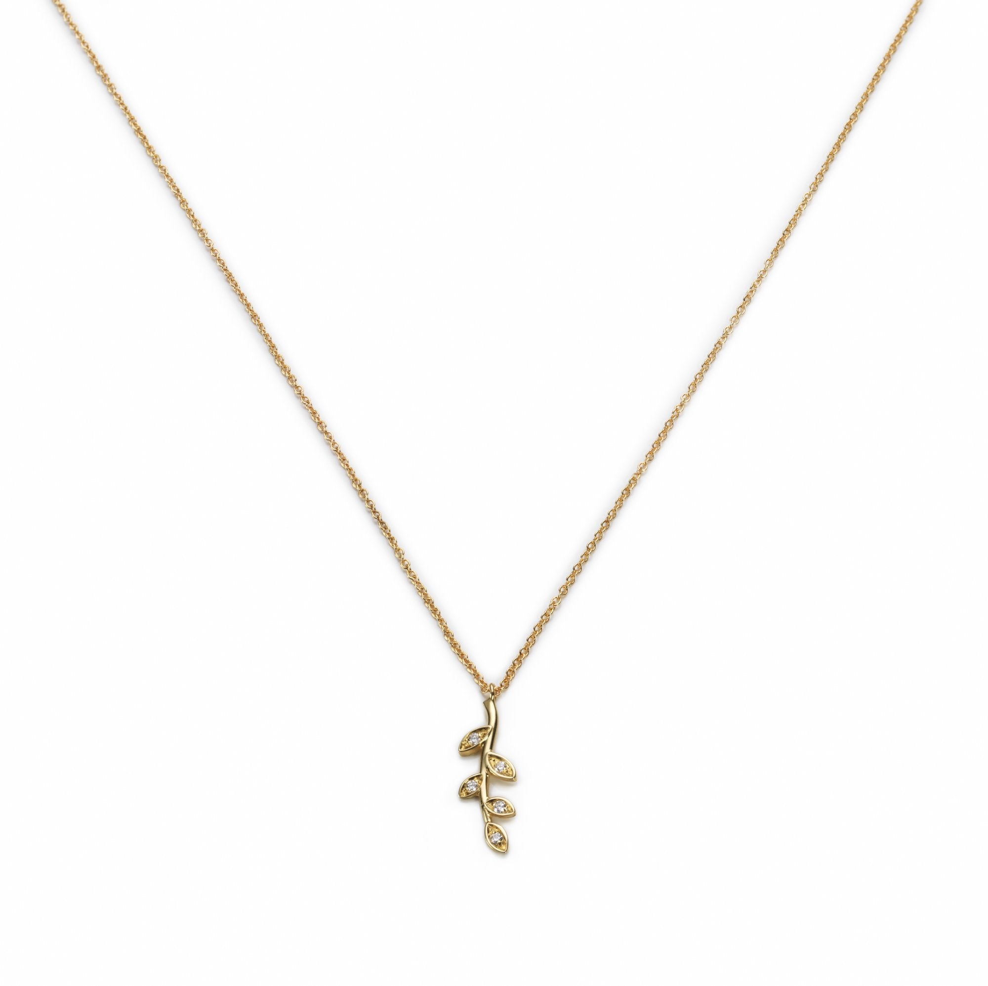 Refined and bucolic, the Flora collection celebrates the vitality of nature by interpreting the art of jewelery in a contemporary way. The Necklace made of 18 kt yellow gold chain features a sprig with slab leaves and white diamonds which make it a precious and versatile creation. Wear it alone or combined with other jewels from the Flora collection.