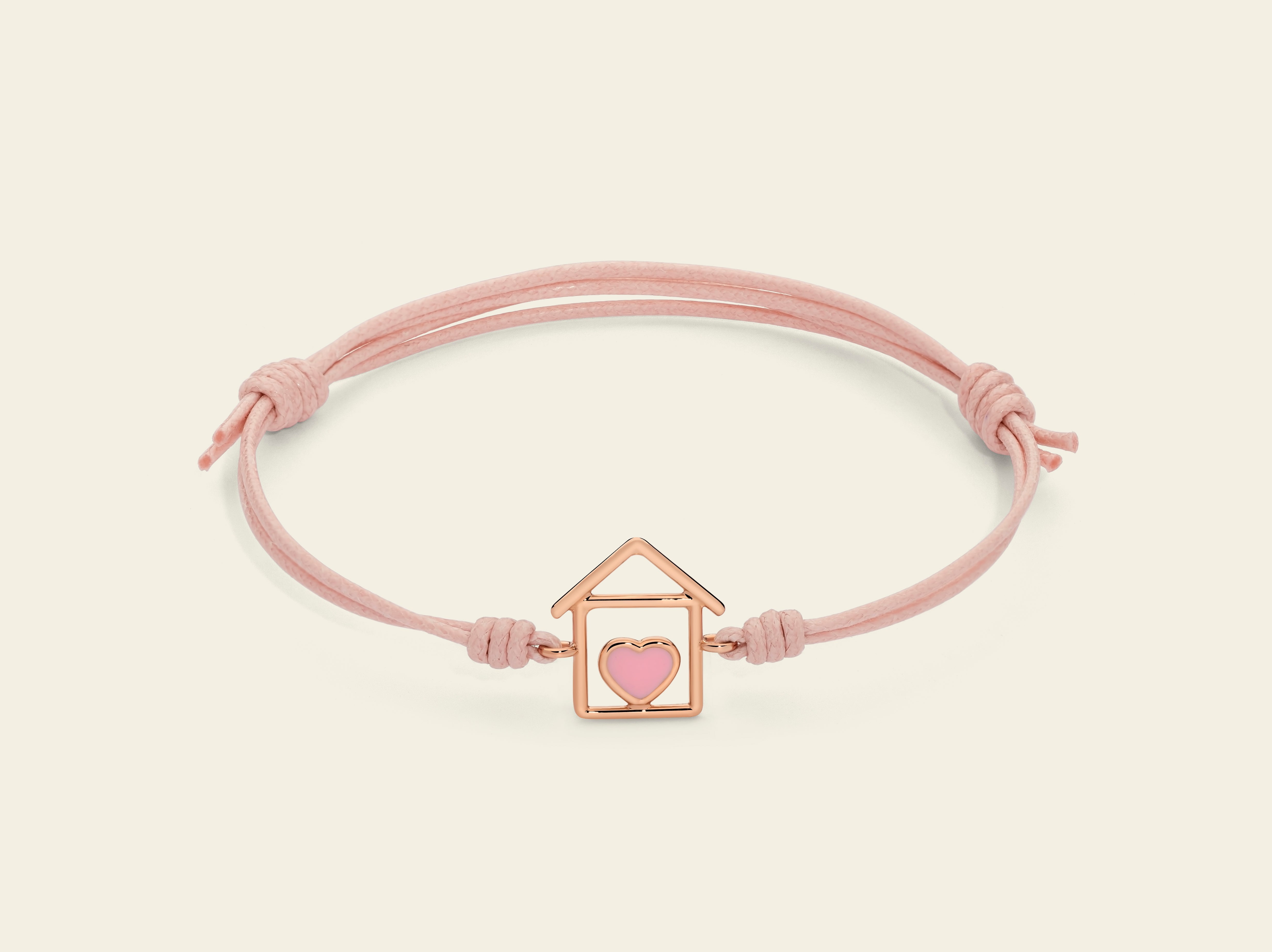 A house that holds a heart inside. This is the common thread of the Il Cuore fa Casa Collection. The Cord Bracelet with the house in the center in 18 kt rose gold thread with an enameled heart celebrates in a refined way the warmth and certainty that only a home and a family can give. Wear it alone or combined with other jewels from the Il Cuore fa Casa collection.